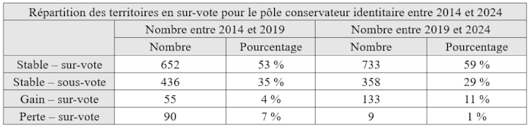 Entre 2014 et 2019 et entre 2019 et 2024, le premier élément qui démarque particulièrement ce pôle des deux autres, est le nombre de territoires stables par leur sur-vote, autrement dit, de territoires qui votent de façon supérieure à la moyenne nationale à l’ensemble des élections.