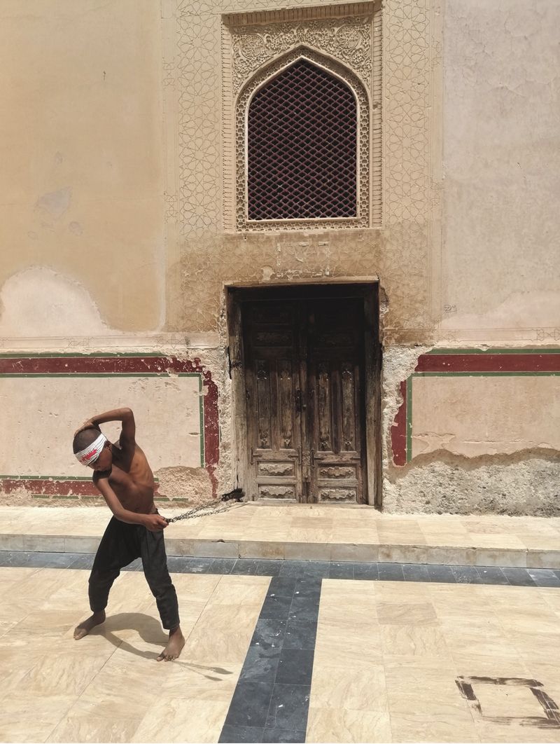 Shergarh, Pendjab, Pakistan. Les musulmans chiites commémorent chaque année le martyr de l’imam Hussein lors des célébrations d’Achoura. Aux assemblées populaires mêlant louanges et deuil collectif, se joignent des scènes d’auto-flagellation strictement encadrées en Iran et en Azerbaïdjan où l’islam chiite est majoritaire. L’État se garde toutefois d’intervenir lorsqu’il est minoritaire, comme au Pakistan ou au Liban, laissant court aux effusions de sang. Si la pratique est restreinte aux hommes adultes, de jeunes enfants s’y adonnent à la marge, entendant embrasser ce rituel d’affirmation masculine. Sur le seuil du mausolée du village de Shergarh, ce jeune garçon répète sur son dos les va-et-vient des chaînes et des lames, au rythme des chants du rassemblement principal dont il se tient caché. (19 août 2021)