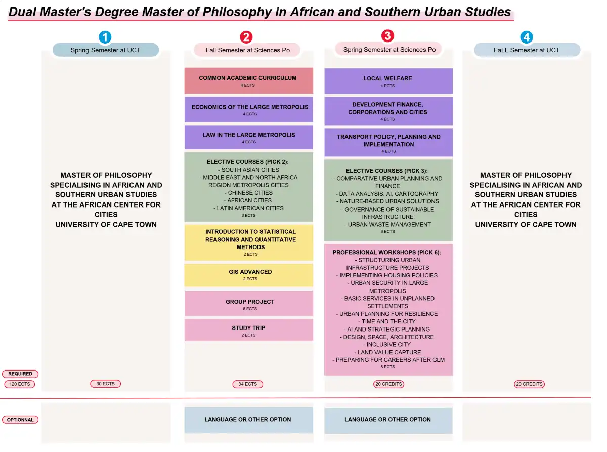 Students begin the programme in Cape Town in January with the first semester of the Master of Philosophy in Urban Studies specialising in Southern Urbanism at the African Center for Cities. At Sciences Po, students will be enrolled in the first year of the two-year Master’s programme “Urban Governance, Policy and Planning”, “Governing the Large Metropolis” stream, offered at the Urban School. Finally, during the last semester, students return to UCT to complete both coursework and a research component, culminating in the submission of a master’s dissertation. The courses from this final semester can be followed online, to allow Students to deep-dive in field work.