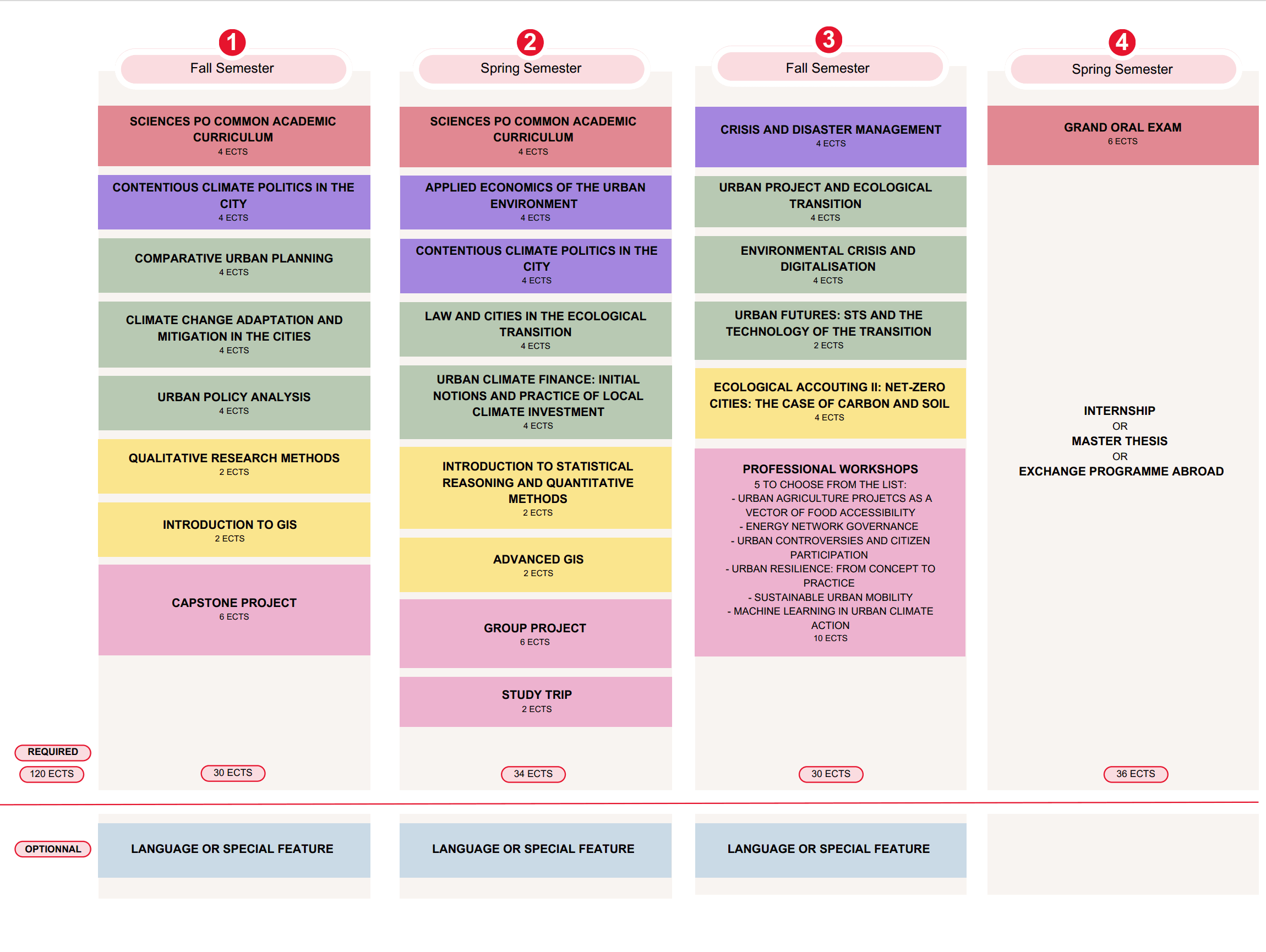 During the first semester, students follow courses devoted to understanding the basics of urban policy and governance and the challenges of the ecological transition in Europe and the world. During the second semester, students learn to analyze cities as social and ecological systems and acquire essential tools to jumpstart and lead the transition.