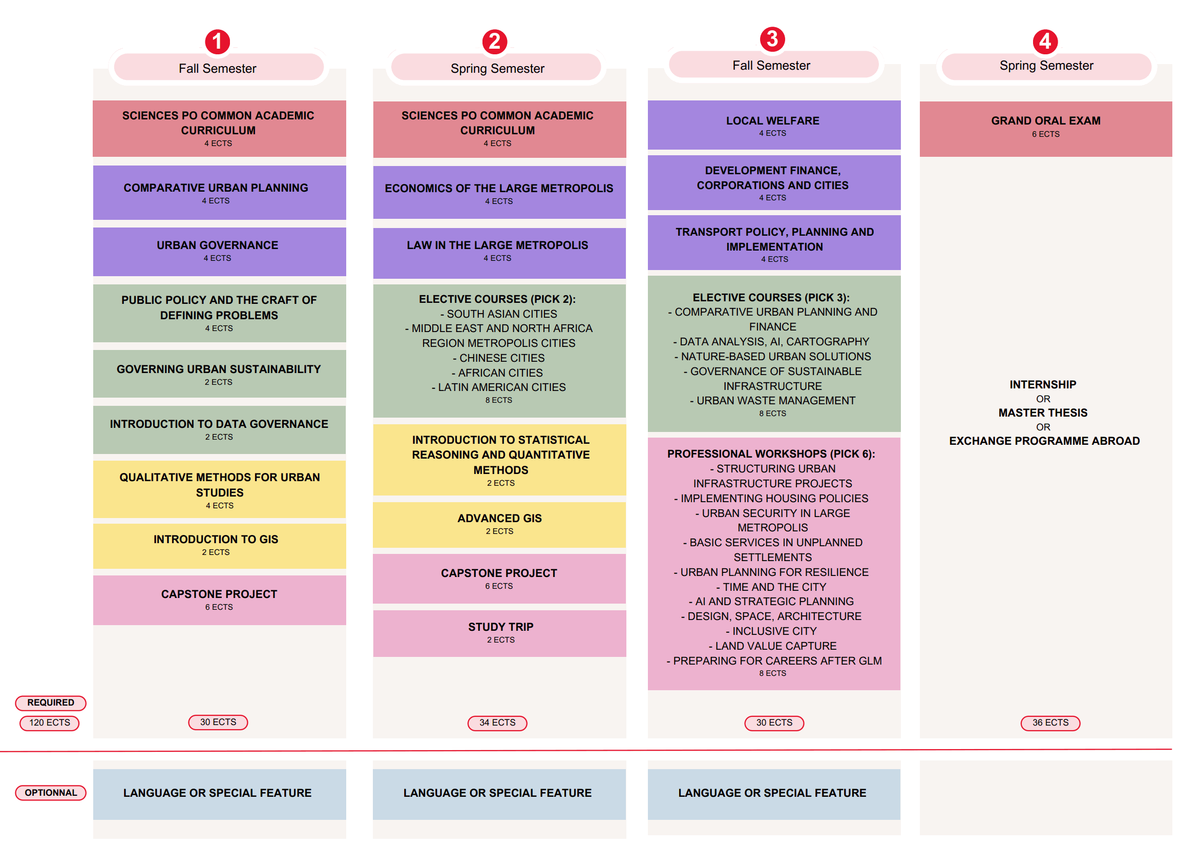 Au premier semestre, les étudiants abordent des sujets pluridisciplinaires tels que la politique publique, la politique numérique et l'urbanisme, en mettant l'accent sur les compétences en recherche. Ce semestre se concentre sur le développement des compétences en rédaction académique et professionnelle, le travail d'équipe (projet collectif) et le perfectionnement de la prise de parole en public. Le semestre 2 met l'accent sur l'expérience pratique à travers le voyage d'études, des cours de droit, d’économie, de statistiques et des spécialisations par régions.