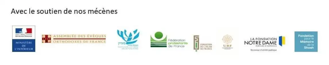 La formation bénéficie également du soutien financier des mécènes suivants : La Fédération protestante de France, la Fondation de l’Islam de France, la Fondation Maayan, la Fondation Notre Dame, la Fondation pour la Mémoire de la Shoah, la Métropole orthodoxe grecque de France, le Ministère de l’Intérieur, l’Union bouddhiste de France.