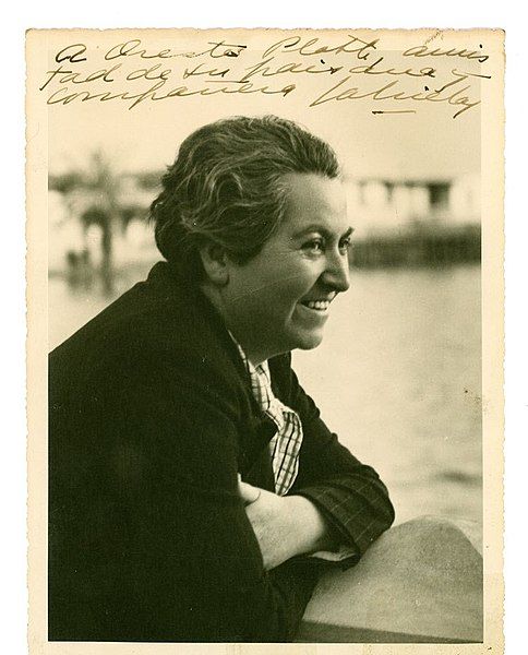 Lucila Godoy Alcayaga est née dans la région de Coquimbo au Chili en 1889. Elle se destine à une carrière d’institutrice, tout en se consacrant au journalisme et à l’écriture. Elle connaît ses premiers succès à l’âge de 25 ans, pour ses Sonetos de la Muerte [Sonnets de la mort], et commence dès lors à publier sous le pseudonyme de Gabriela Mistral et à voyager et publier à l’étranger. Dans les années 1930, elle devient diplomate puis consul jusqu’à la fin de sa carrière : elle représentera le Chili en Espagne, au Portugal, en Italie, en France, au Brésil, et aux États-Unis.