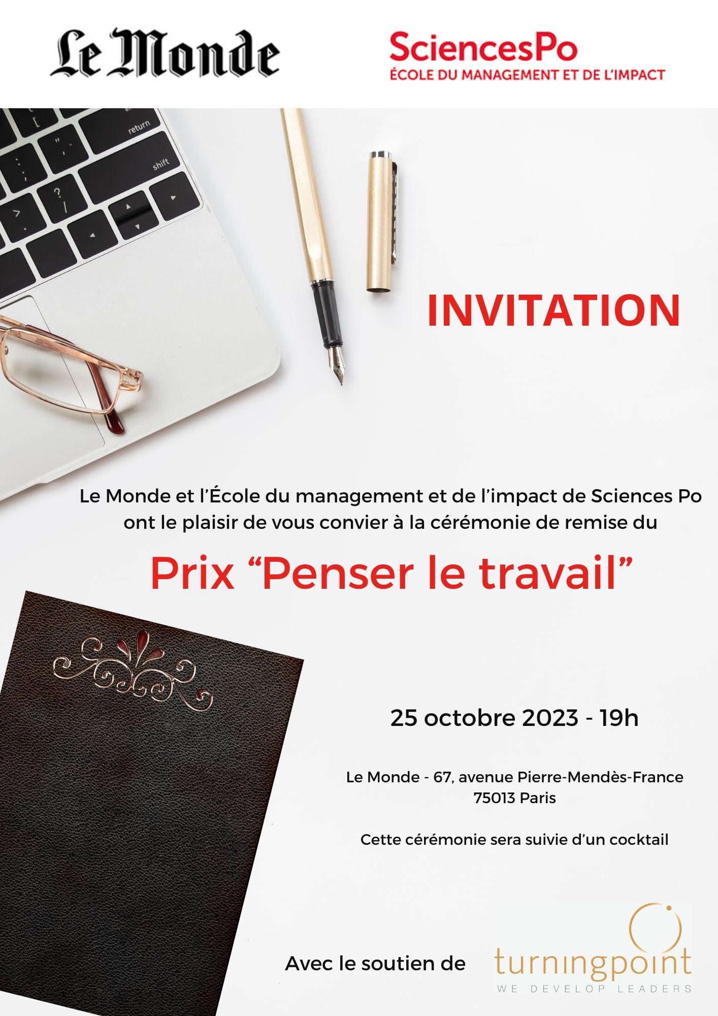 Le Monde et Sciences Po ont le plaisir de vous convier à la cérémonie de remise Prix " Penser le travail", fruit d'un travail réunissant les professionnels des RH et du conseil en management, les chercheurs en sciences sociales et les étudiants du Master RH et gouvernance durable de Sciences Po.