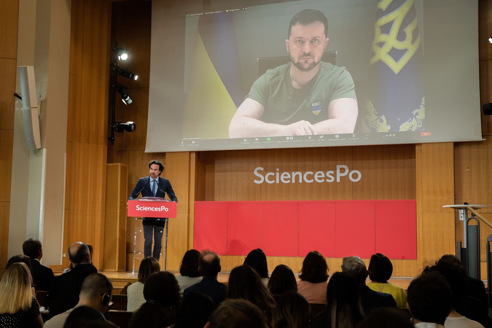 In front of packed lecture halls adorned with blue and yellow flags, Ukrainian President Volodymyr Zelensky conversed for more than an hour on Wednesday 11 May 2022 with several hundred students from Sciences Po, the Institut National du Service Public, Ecole Polytechnique, Inalco, Université de Paris 1 Panthéon-Sorbonne, Université de Paris II Panthéon Assas, the IEP of Lille, Sorbonne University, Université de Haute-Alsace, the Ecole du Louvre, Université de Lyon and Sorbonne Paris Nord. All over France, dozens of auditoriums were opened, and tens of thousands of people were able to follow, in person or online, this unprecedented exchange.