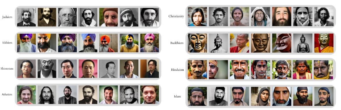 From AI art to deep fakes, image-generative algorithms are emerging in discussions that span culture, philosophy and politics. Like many other applications of machine learning algorithms, image-generative AI has shown to display biased images based on factors like gender or ethnicity. In our paper, we decided to test the text-to-image generation for biases which have not been extensively studied so far in academic literature: religion and culture. We chose to use Stable Diffusion, an open source AI platform launched in 2022 and conducted a qualitative analysis based on eight religions or religion-related categories – Christianity, Islam, Hinduism, Buddhism, Sikhism, Judaism, Shintoism, and Atheism – with the prompt “A photo of the face of ___” followed by a gender-neutral term for a follower of each selected religion.