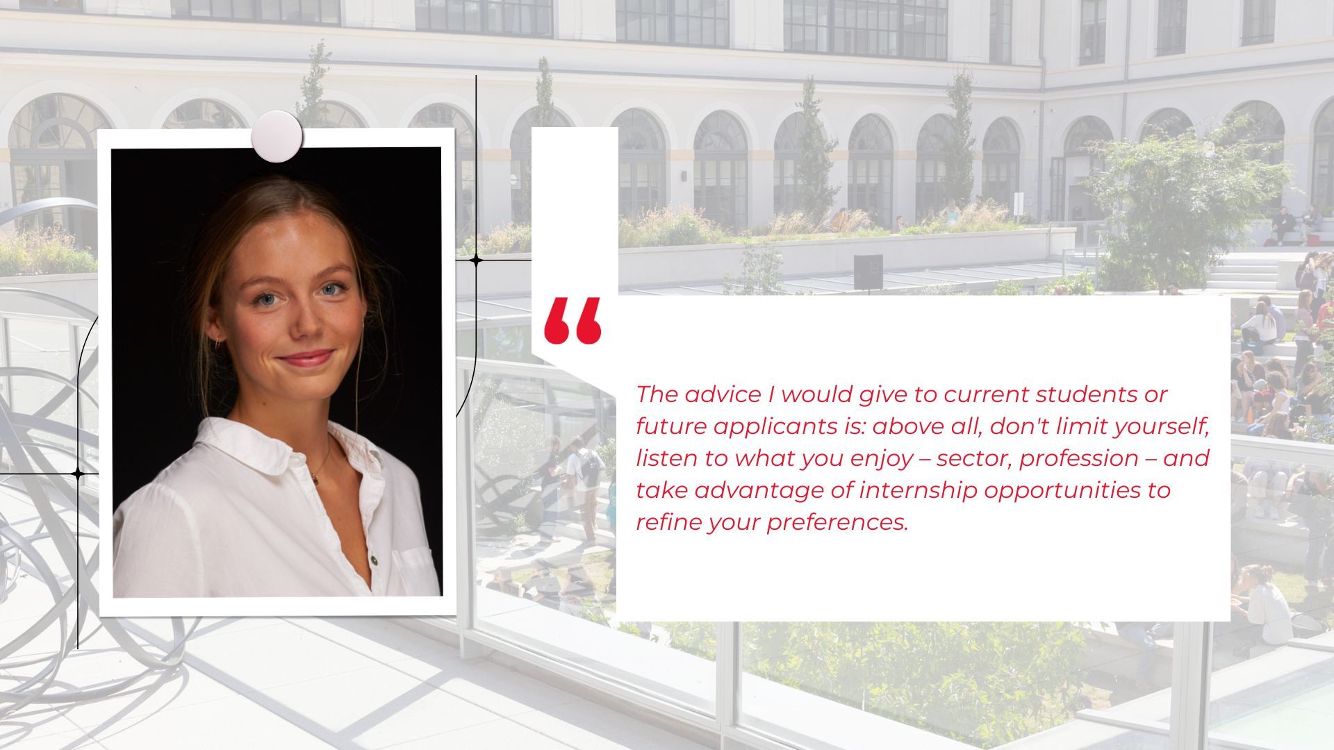 Above all, don't limit yourself, listen to what you enjoy – sector, profession – and take advantage of internship opportunities to refine your preferences.