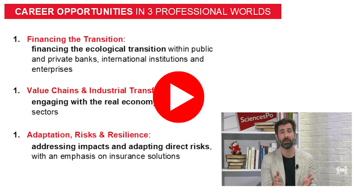 For the first specialization, “Financing the Transition”, opportunities lie within financial institutions: private banks, asset‑management firms, but also public development banks. For example, the French Development Agency at the national level, the European Investment Bank at the regional level, and at the international level institutions like the World Bank. And of course, graduates will have opportunities in working in consulting firms, and international organizations such as the UN or the OECD.