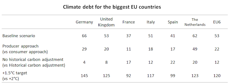 This estimation also highlights the sensitivity of climate debt to the sharing rules – namely how the carbon budget is to be split between the countries of the globe. For example, depending on whether we share the carbon budget based on a snapshot of Europe’s share of global emissions taken in 2018 or 1990, the climate debt varies from a ratio of 4 to 1.