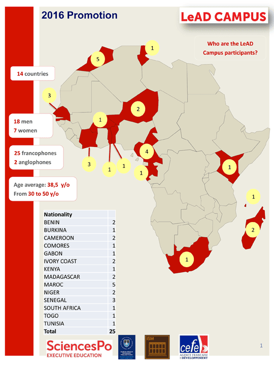 Continent d’avenir, l’Afrique offre une multitude d’opportunités. Détecter les leaders et futurs leaders africains, les réunir dans une communauté, les accompagner dans le développement de leurs compétences et de leurs projets pour assurer la croissance durable et inclusive de l’Afrique ; telle est l’ambition du programme LeAD Campus – Leaders pour l’Afrique de Demain.