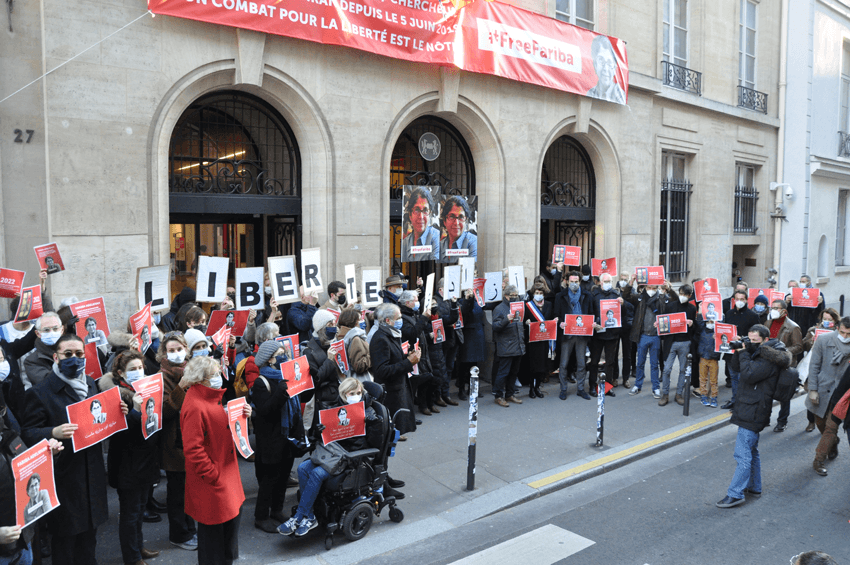 1er mars 2022 : rassemblement devant la mairie de Paris en soutien à Fariba Adelkhah emprisonnée depuis 1 000 jours.