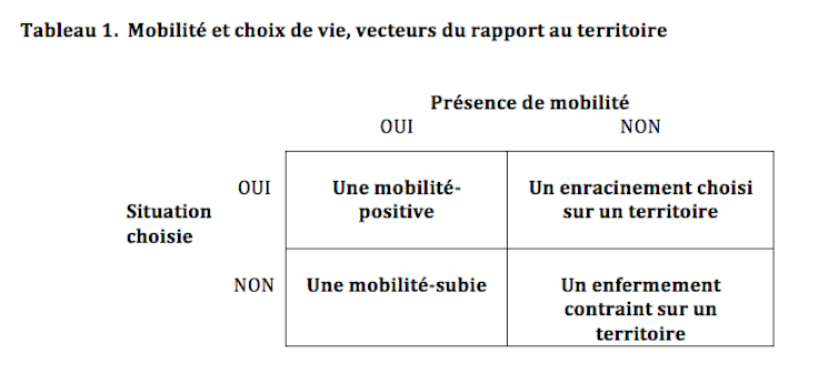 En considérant la mobilité non seulement selon sa présence ou son absence, mais aussi selon le fait qu’elle soit voulue ou non, nous avons identifiés quatre situations type de rapport à la mobilité (Tableau 1).