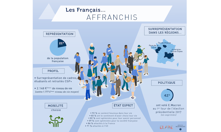 Ces Français sont des « Affranchis » et représentent 21 % de la population. Ils sont surreprésentés parmi les cadres et professions intellectuelles supérieures et les étudiants. Plus de 6 « Français affranchis » sur 10 résident dans des agglomérations de 100 000 habitants et plus, dont l’agglomération parisienne, et ils vivent davantage en centre-ville que les autres catégories de Français.