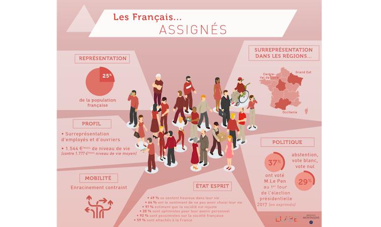 La sociologie des « Français assignés » dessine une France qui va mal et qui souffre des inégalités sociales. Elle est majoritairement composée de quadragénaires et de quinquagénaires des classes populaires : 59 % d’entre eux ont entre 35 et 64 ans, et 57 % sont des employés, des ouvriers ou des retraités CSP-. Parmi les quatre catégories de Français, ce sont ceux dont la part ayant obtenu un diplôme de l’enseignement supérieur est la plus basse.