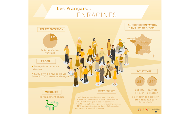 Celui-ci traduit un attachement au territoire local et à ses racines. Les individus qui sont dans cette situation se sentent globalement bien là où ils vivent et goûtent au bonheur de « vivre au pays », dans des territoires qui leur offrent le cadre d’une vie sociale riche et de bonne qualité. Ces Français sont des « Enracinés » et représentent 22 % de la population.