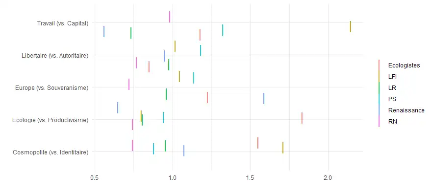 Les nombreuses variables du questionnaire ont été regroupées en cinq grands indicateurs de valeurs, correspondant à des clivages bien connus : écologisme vs productivisme, travailleurs vs patronat, européisme vs souverainisme, cosmopolitisme vs identité, libertarisme vs autoritarisme.