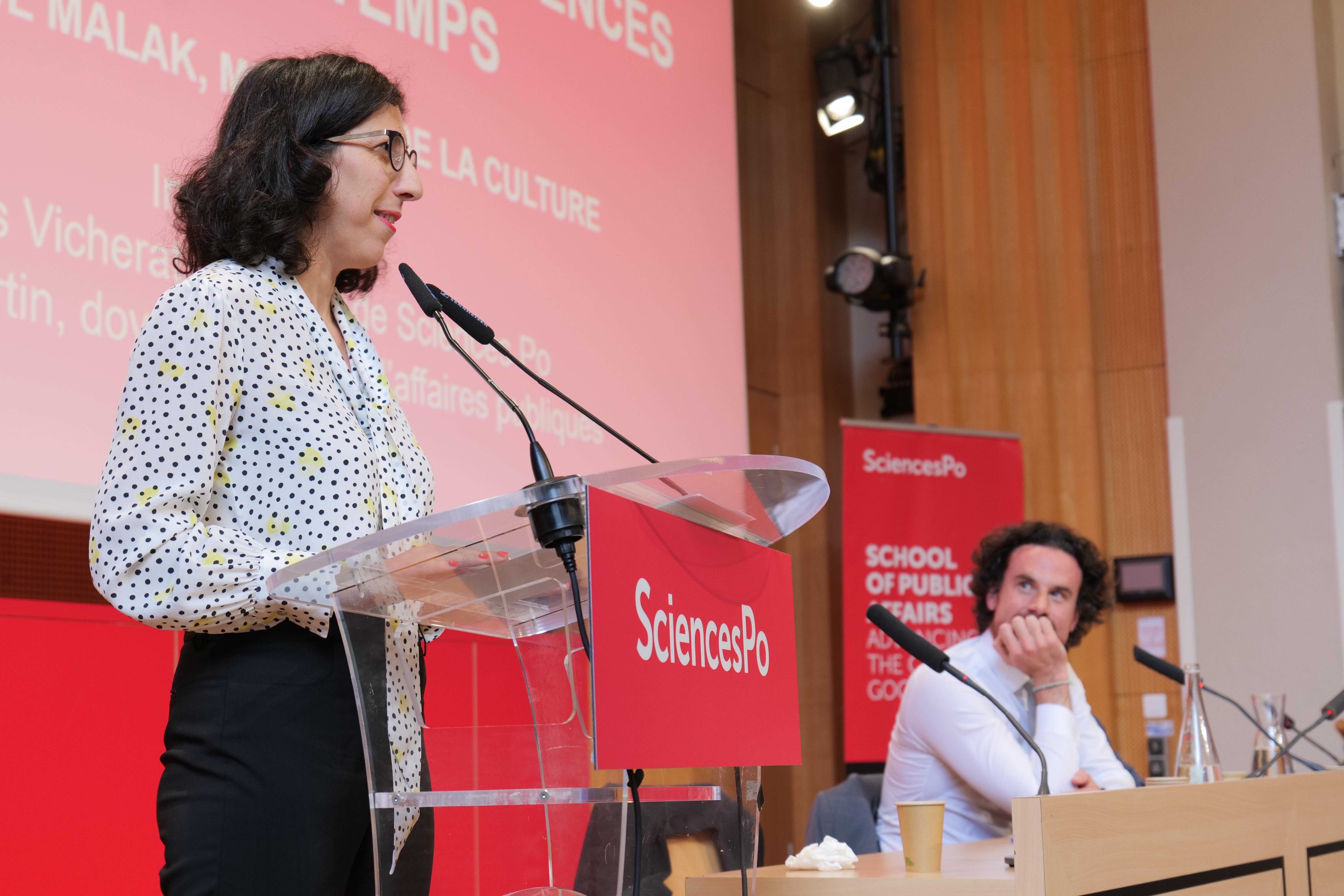 Après un retour par le directeur de Sciences Po et le doyen de l’École d'affaires publiques sur les fondamentaux de cette formation, ses ambitions et ses évolutions, Rima Abdul Malak, ministre de la Culture, a partagé avec les étudiants son parcours et la manière dont celui-ci a nourri ses aspirations.