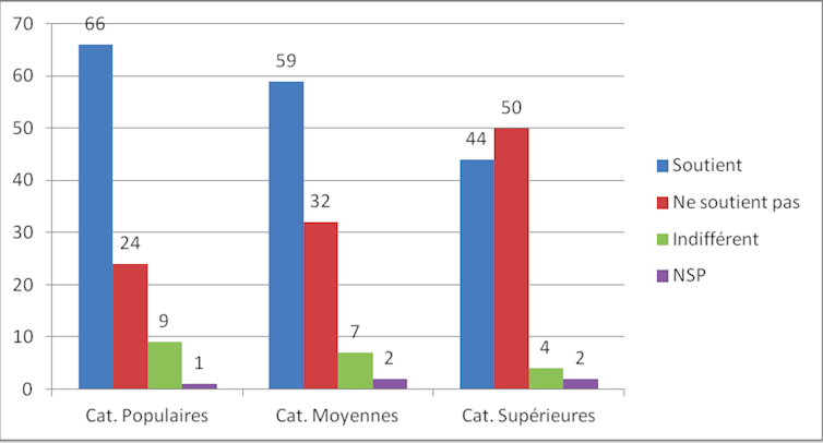 On peut encore illustrer cette opposition en lisant ces données par distribution entre catégories : 40 % des enquêtés appartenant aux catégories populaires soutiennent « tout à fait » le mouvement contre 15 % de ceux qui appartiennent aux catégories supérieures et 10 % des premiers ne le soutiennent « pas du tout » contre 26 % des seconds.