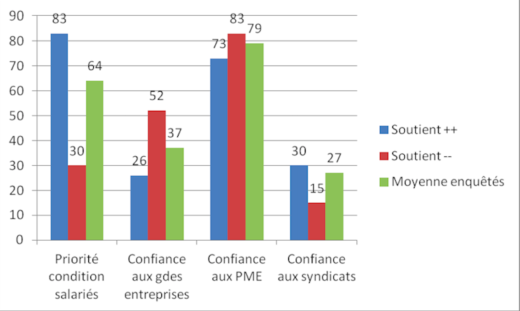 Cette première lecture électorale, qui conduit à penser que l’on est donc dans le « ni gauche ni droite », doit cependant être très vite corrigée par la lecture des autres variables. On voit ainsi que 44 % de ceux qui soutiennent « tout à fait » le mouvement font confiance à Marine Le Pen (dont 21 % disent qu’ils n’avaient pas confiance en elle mais qu’elle a gagné leur confiance) contre 27 % à Jean‑Luc Mélenchon.