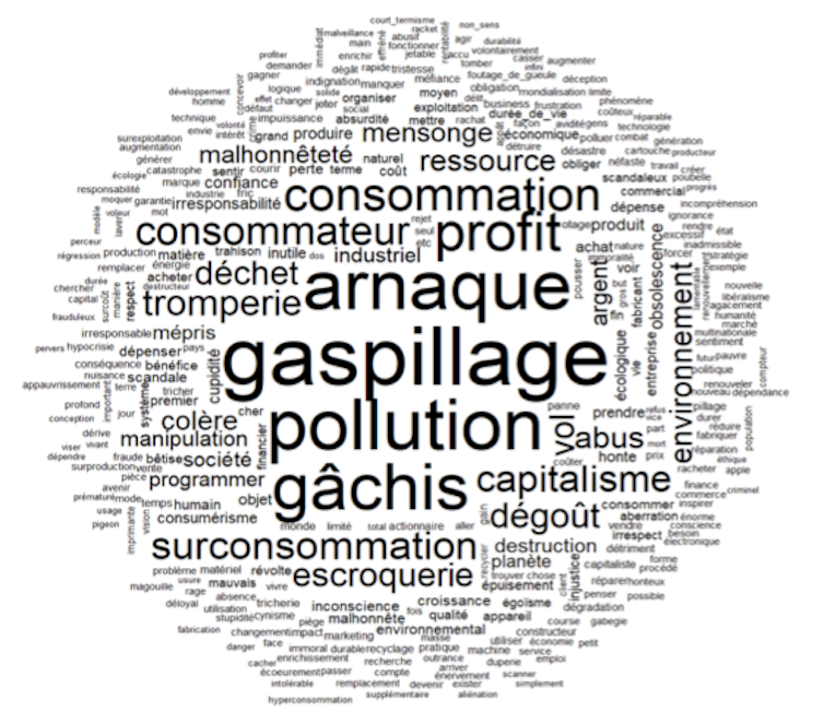 L’analyse des trois termes les plus cités fait part de cette polysémie. En premier, le « gaspillage » (mentionné 387 fois), terme hautement normatif, évoque le non-sens causé par le raccourcissement de la durée de vie des objets. En deuxième, la « pollution » (330 fois) pointe du doigt les conséquences environnementales déjà citées. En troisième, l’« arnaque » (321 fois) fait davantage référence au duo producteur-consommateur, à travers une accusation indignée du système industriel, plaidant pour une meilleure protection des acheteurs. Ces termes embrassent donc des aspirations à gagner en autonomie, en tant que consommateurs et citoyens, vis-à-vis des produits.