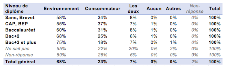 Cette capacité à regrouper des profils et des intérêts aussi variés est liée au fait que la cause de la durée de vie des objets rassemble autour de plusieurs enjeux. Les répondants s’accordent à dire que l’obsolescence programmée a beaucoup, voire énormément, de conséquences négatives sur l’environnement, mais aussi sur le consommateur. Le volet environnemental de la cause est souvent mis en avant : plus des deux tiers des répondants se disent plus sensibles à cet enjeu. Mais un quart des répondants priorise plutôt la défense du consommateur, priorité qui s’accroît quand le niveau de diplôme est plus faible.