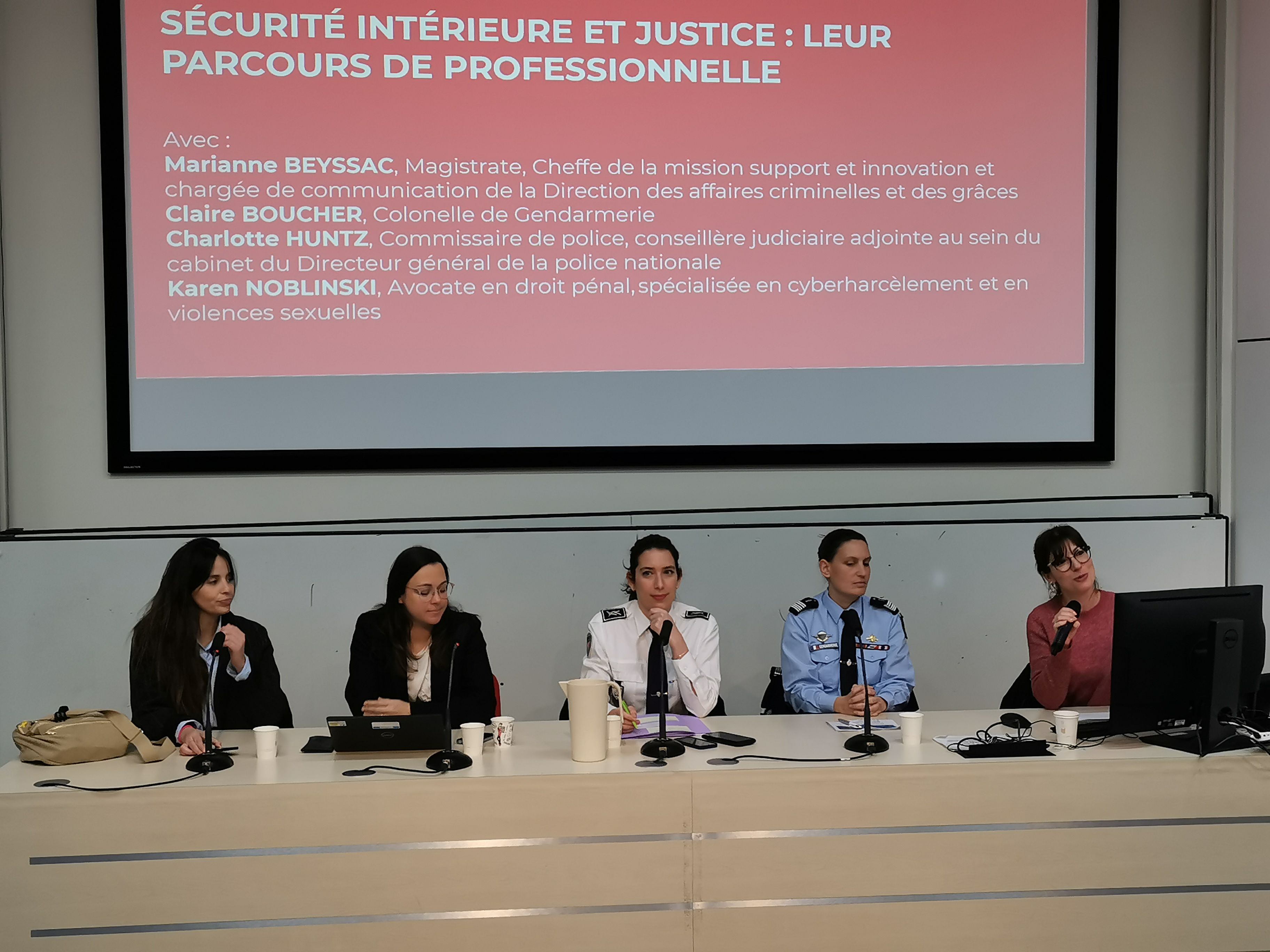 Les enseignantes invitées ont débuté la conférence en racontant ce qui a dessiné leurs choix d’orientation, évoquant le goût du terrain, le sens de l’intérêt général, et la diversité d’acteurs. Elles ont insisté sur la possibilité d’orienter sa carrière en fonction de sa sensibilité, en revenant sur leurs engagements contre les violences faites aux femmes, qui tissent chacun de leurs parcours.