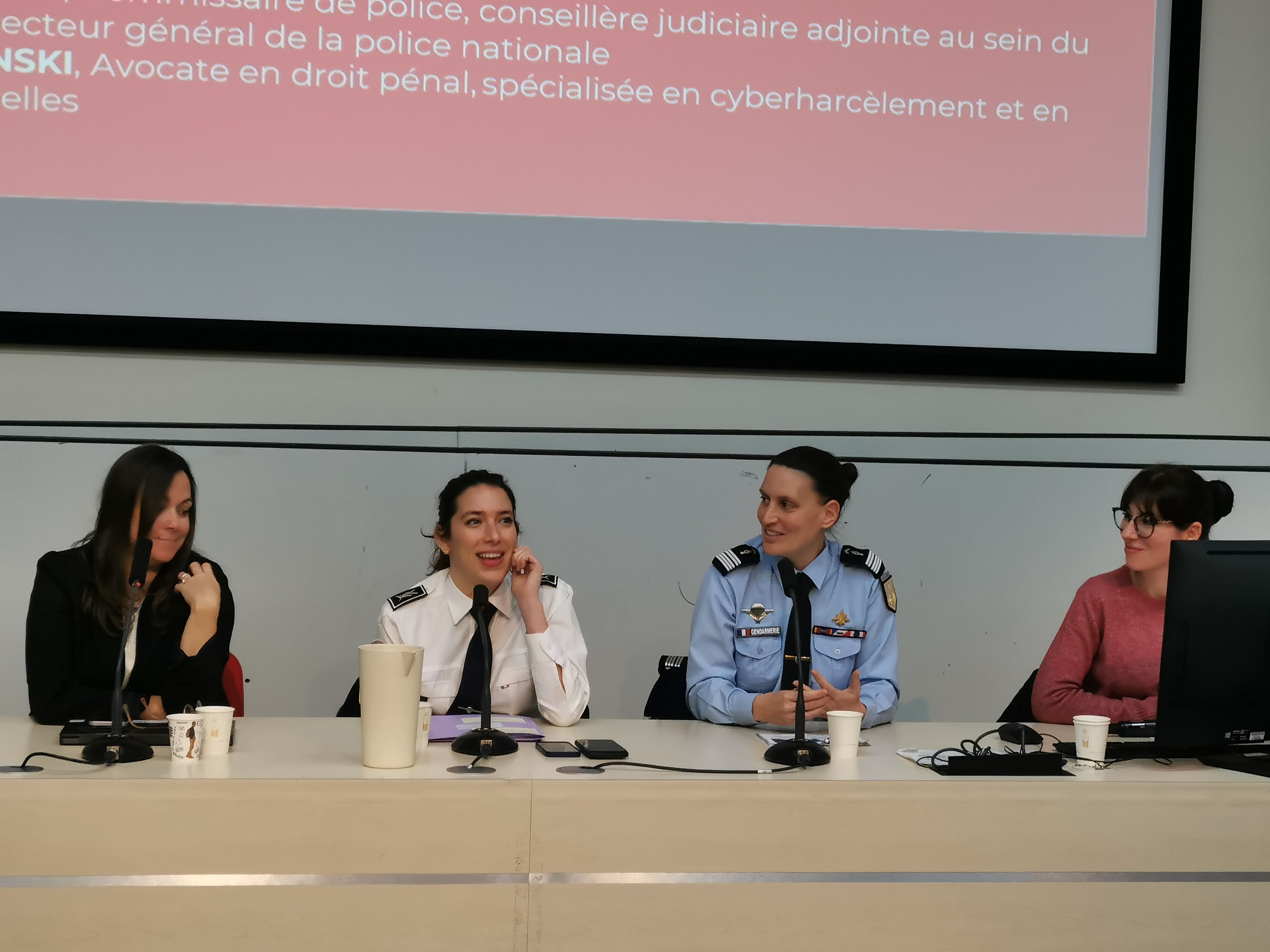 Ce partage de réalités communes a permis d’alimenter une réflexion sur l’intersection des discriminations liées au genre et à la jeunesse, notamment au sein des institutions de la sécurité, qui sont principalement masculines, avec près de 79% d’hommes dans la Police et Gendarmerie (source : Insee, Siasp 2019). Le milieu judiciaire, s'il a connu une forte féminisation, est caractérisé par des inégalités d’accès à la progression hiérarchique. Les quatre intervenantes ont fait part des stratégies parfois mises en place pour asseoir leur légitimité dans ces environnements professionnels, en effaçant par exemple les expressions de leur féminité dans l'exercice de leurs fonctions. Elles ont souligné l’importance de changer les représentations stéréotypées associées à leurs professions en continuant à être elles-mêmes.