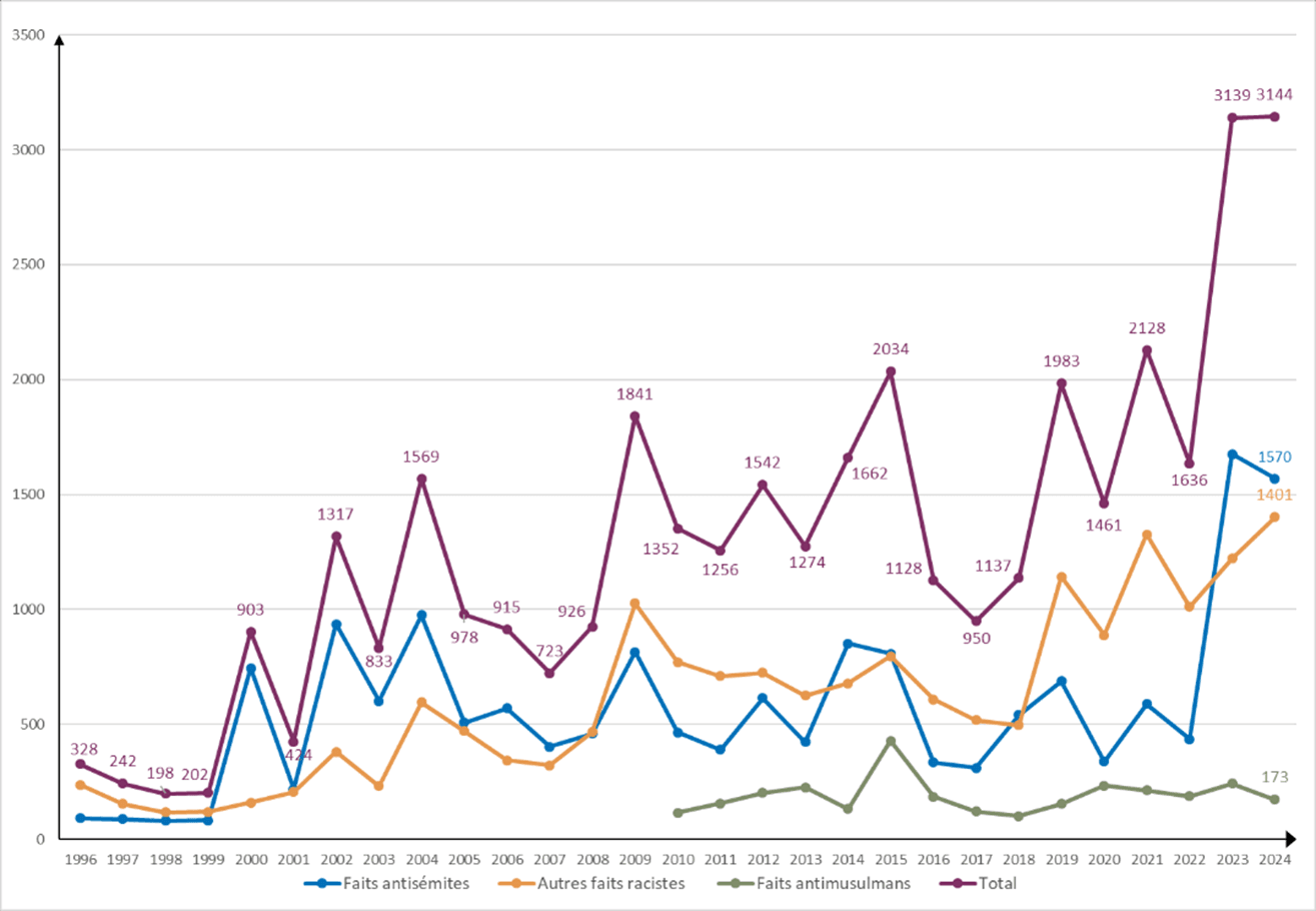 Le second outil est la comptabilisation par la Direction nationale du renseignement territorial (figure 2) des faits racistes et antisémites portés à sa connaissance par ses relais territoriaux et ses partenaires locaux s’ils donnent lieu à un dépôt de plainte ou une intervention de police. 2023 avait été marqué par la hausse sans précédent des faits antisémites (1676, quatre fois plus qu’en 2022) commis pour l’essentiel dans les trois mois suivant le 7 octobre, et dans une moindre mesure celle des faits anti-musulmans (242, +29%). On note, comme pour les opinions, une relative décrue en 2024, avec 1570 incidents antisémites (-6%) et 137 antimusulmans (-28%). Mais dans le même temps, les autres faits racistes (anti-noirs, anti-maghrébins, anti-roms, anti-asiatiques) sont en hausse (1401, +15%). Et il faut tenir compte d’une sous-déclaration persistante des actes anti-musulmans, à laquelle devrait remédier le lancement prochain d’une plateforme de signalement en ligne, à l’initiative conjointe de l’État et de l'Association de défense contre les discriminations et les actes antimusulmans (ADDAM).
