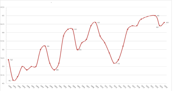 La CNCDH s’appuie sur deux instruments pour mesurer ces évolutions, l’un relatif aux préjugés, l’autre aux actes racistes et antisémites. Le premier est son Baromètre racisme annuel conduit auprès d’un échantillon national représentatif de la population adulte métropolitaine. L’indice longitudinal de tolérance (ILT) mis au point par Vincent Tiberj synthétise les réponses à 75 questions régulièrement posées depuis 1990. Il varie entre 0 et 100 par niveau croissant de tolérance. En 2023, dans le contexte particulier post 7 octobre, il avait chuté de 3 points, passé de 65 à 62. L’indice spécifique à la minorité juive, d’ordinaire la mieux acceptée, avait même perdu 4 points, un recul essentiellement dû à la revitalisation par le conflit du vieux stéréotype de la « double allégeance », mesuré par le sentiment que « pour les Juifs français, Israël compte plus que la France » (+ 7 points en un an). En 2024, l’ILT global est toutefois reparti à la hausse (+1) (figure 1) et l’indice relatif aux juifs également (+1). En revanche, celui des Roms, peu présents dans le débat public cette année, monte en flèche (+5 points). Ces derniers restent la minorité la plus rejetée, avec un indice 11 points en dessous de l’indice global, mais il n'a jamais été aussi élevé (52).