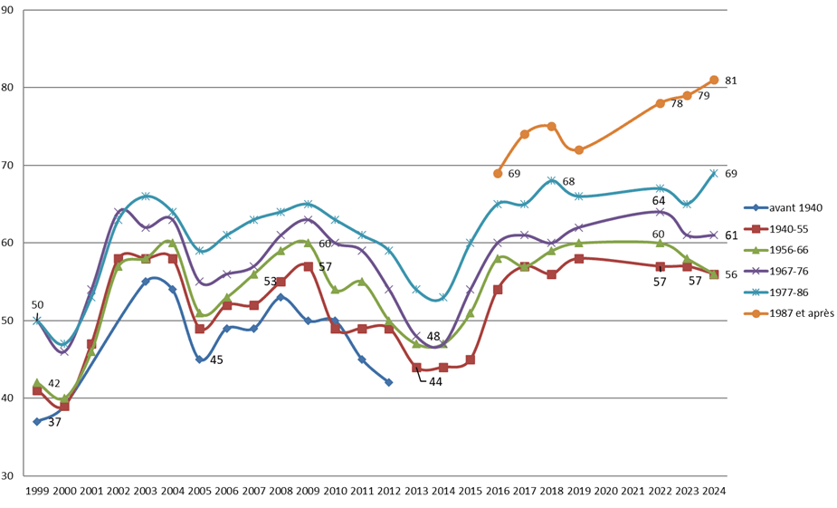 L’année 2024 montre également une forte polarisation générationnelle (figure 3) : les cohortes récentes voient leurs niveaux de tolérance, déjà hauts, progresser, tandis que chez les plus anciennes, ils stagnent ou reculent. Chez la cohorte la plus récente, née après 1987, l’ILT a atteint un record historique en 2024, supérieur de 25 points à celui des cohortes nées avant 1966. Le positionnement politique enfin a un poids croissant. Le niveau de l’ILT chez les sondés de gauche et du centre monte, atteignant un maximum historique en 2024 (73 et 61), alors qu’à droite depuis 2019 il stagne aux alentours de 49.