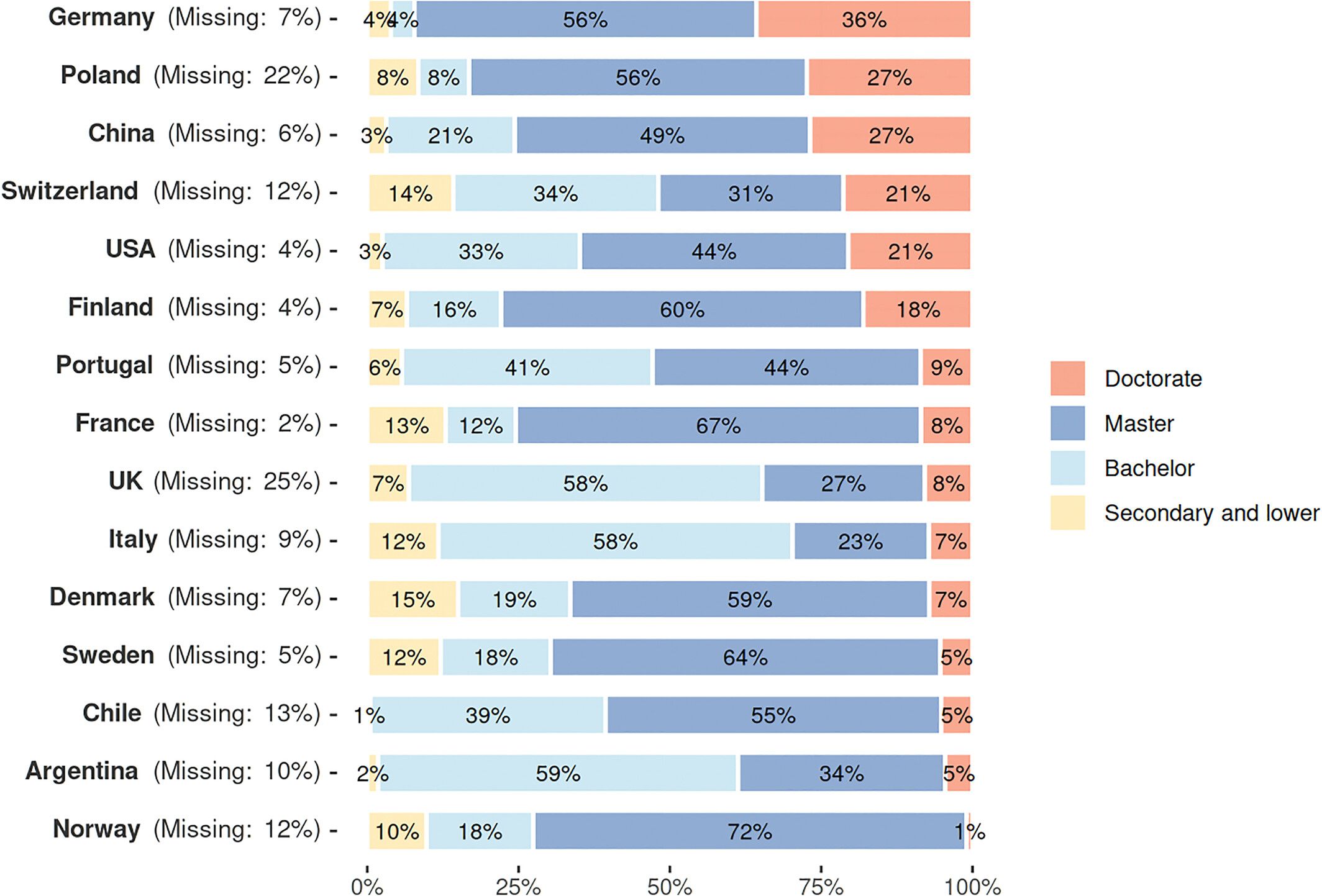 Les niveaux d’éducation varient aussi : si le niveau master prédomine dans la majorité des pays dont la France (où l’on observe une prédominance des grandes écoles), le niveau licence est majoritaire en Argentine, en Italie et au Royaume-Uni.