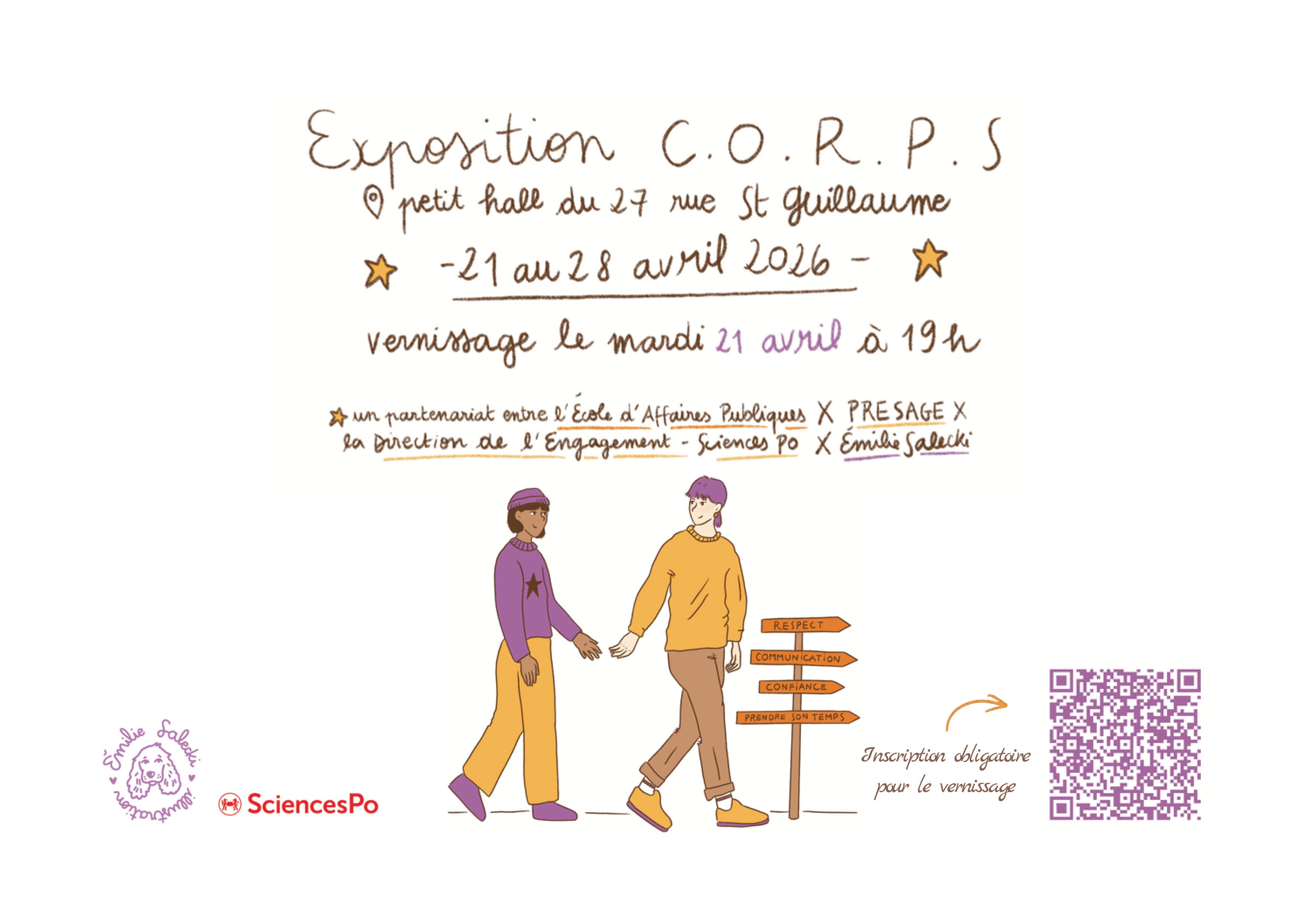 This exhibition was conceived and created in spring 2026 by five students as part of the Certificate in Women-Men Equality and Public Policy at Sciences Po Paris, in partnership with the Student Health Service and the SGBV Team. Designed as a transferable tool intended to circulate beyond Sciences Po, it focuses on education in emotional, relational, and sexual life (EVARS).