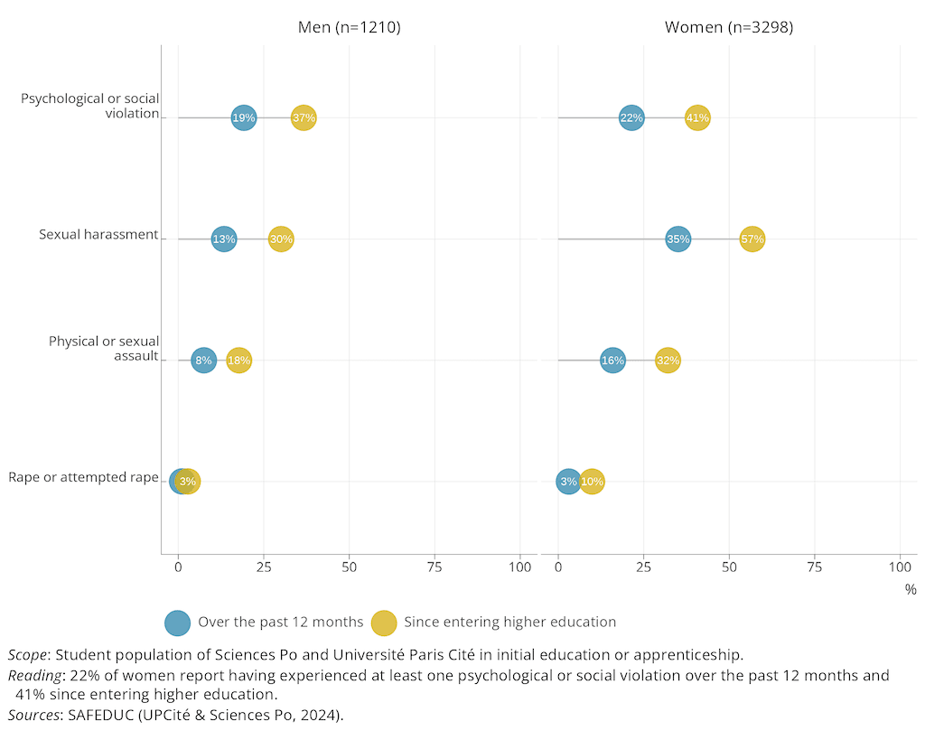 These estimates highlight the high prevalence of gender-based and sexual violence in student life and the over-representation of women among the victims. A significant proportion of respondents report having been exposed to violence since the start of their higher education, as well as in the 12 months preceding the survey.