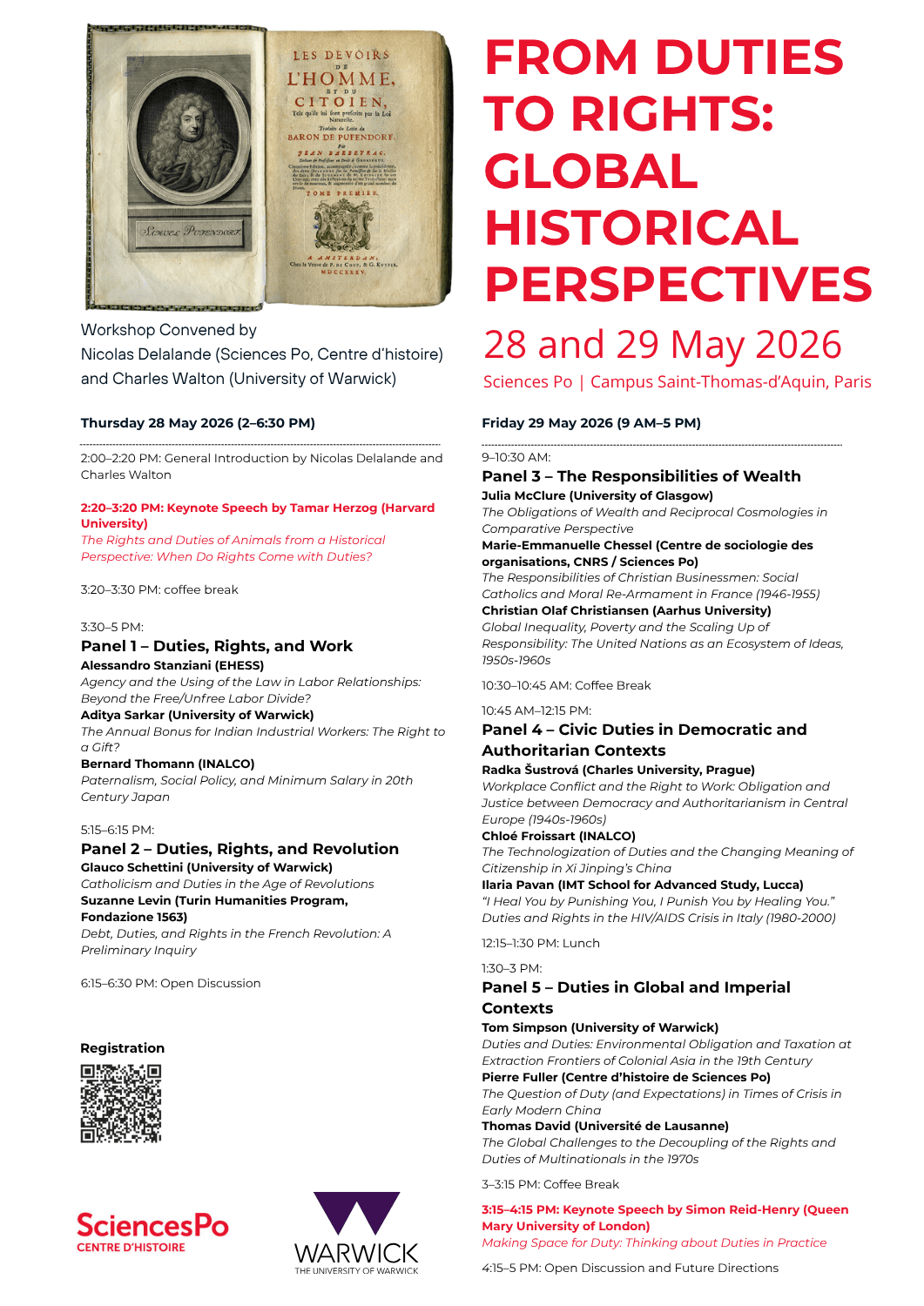 The aim of this workshop is to begin conceptualizing the history of duties and their relationship to rights. Historians have long treated duties as afterthoughts, if at all. Whereas legal scholars are well-aware of the importance of ‘duties’ and ‘duty-bearing’ for litigation, historians have tended to neglect them in their accounts of the development of human rights. How might the history of rights look different after a consideration of duties from the early modern period to our current times? What methodological tools should a history of duties employ? Are there transhistorical patterns or narrative arcs to be uncovered over the longue durée? Finally, how might a history of duties be useful for understanding current struggles over justice and responsibility, both within societies and between human and non-human beings ?