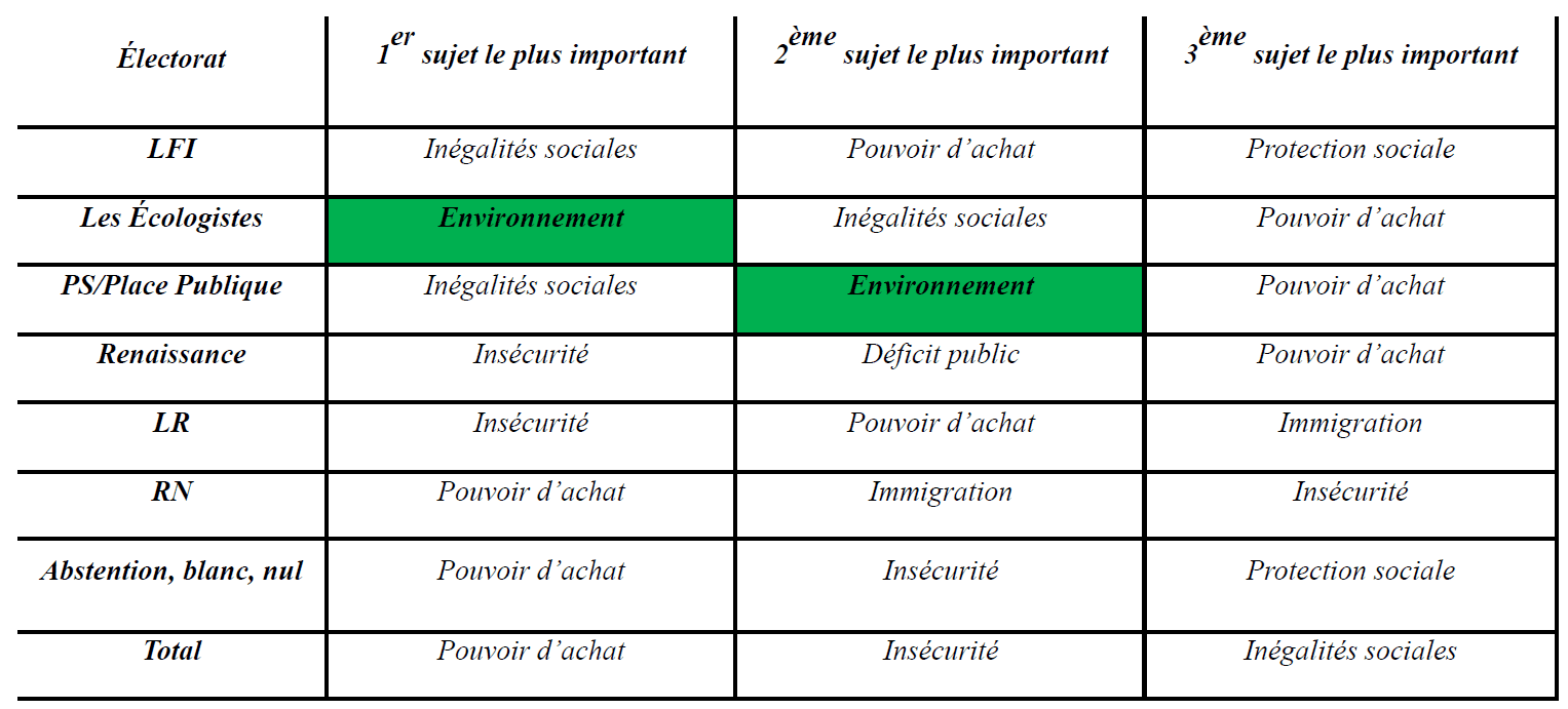 Le Tableau 1 montre que la protection de l’environnement (en vert) ne figure parmi les trois priorités nationales que dans ces deux électorats, alors que le pouvoir d’achat, dans un contexte d’inflation prolongée, s’impose largement comme la préoccupation majeure.