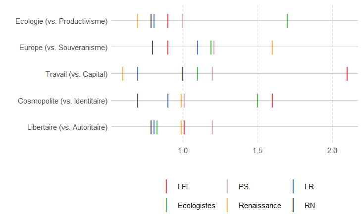 Les nombreuses variables du questionnaire ont été regroupées afin de mesurer la position des enquêté∙es sur cinq échelles de valeurs (variant de 0 à 10), et correspondant chacune à un clivage politique bien connu : écologisme vs productivisme, travailleurs vs patronat, européisme vs souverainisme, cosmopolitisme vs identité, libertarisme vs autoritarisme. L’analyse statistique (régression logistique) montre que chaque électorat se positionne de façon particulière sur ces différents clivages (Figure 2).
