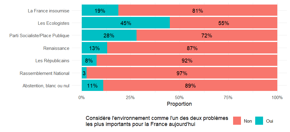 Un premier constat est que l’écologie est demeurée un enjeu secondaire pour la majorité des électorats, malgré sa priorité pour les électeur·ices écologistes et dans une moindre mesure socialistes. La faible visibilité médiatique des questions environnementales pendant la campagne a sans doute renforcé cette marginalité.
