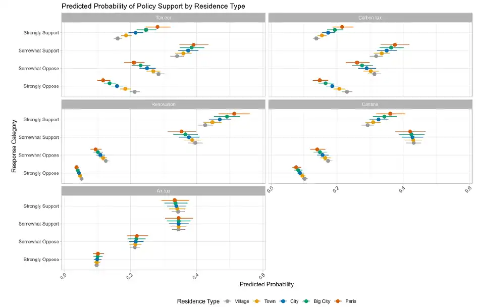 Cet "effet rural" n’est pas monolithique. Sans surprise, les mesures qui imposent des coûts plus élevés en zones rurales (celles dont les coûts sont concentrés sur les zones rurales, telles qu’un péage urbain, ou cumulatifs le long du continuum urbain-rural, comme une taxe sur l’achat de véhicules thermiques) sont moins soutenues par les ruraux que par les urbains. A contrario, des politiques dont le coût ne pèse pas plus sur les ruraux que sur les urbains, comme la taxation du transport aérien, ne suscitent pas moins de soutien parmi les ruraux. Cependant, certaines politiques peuvent engendrer une résistance même en l’absence de coût financiers directs, et ce pour des raisons culturelles : les politiques qui semblent imposer des valeurs urbaines, modifier les paysages et les modes de vie locaux peuvent susciter du ressentiment. Il en va ainsi de la limitation de la consommation de viande dans les cantines, de la densification de l’habitat ou du développement de parcs éoliens.