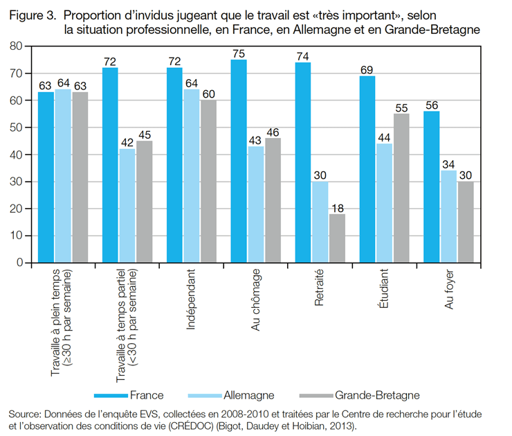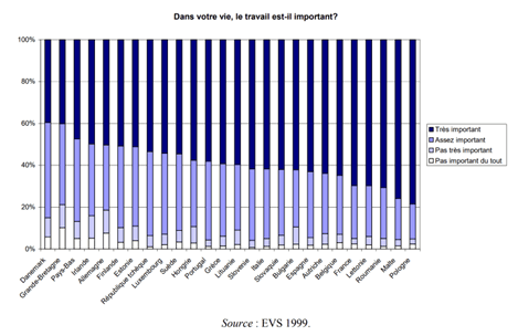 Si la part des Français déclarant le travail très important baisse (un peu) avec le temps, les Français restent néanmoins parmi les Européens les plus nombreux à déclarer que le travail est très important. En 2017, ils étaient encore 62% à déclarer que le travail était très important, contre moins de 50% pour les Danois, les Hollandais, les Allemands ou les Britanniques.