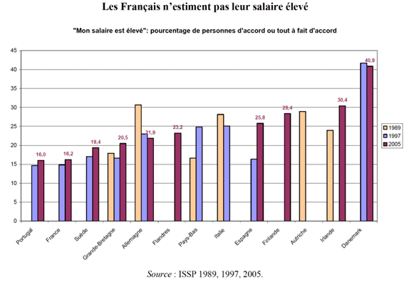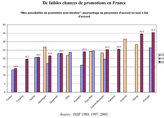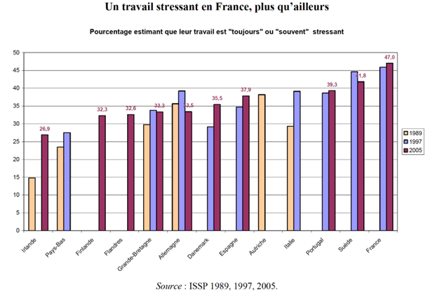 Dans les travaux cités ci-dessus, les mauvaises conditions de travail en France apparaissaient déjà comme une des principales explications du paradoxe français : « La France apparaît mal placée, en Europe, du point de vue de la perception par les salariés de leurs conditions de travail, de la sécurité de l’emploi et des aspects matériels de leur travail. Il en résulte une forte insatisfaction qui pourrait être à l’origine, pour une partie de la population, d’un certain retrait vis-à-vis de la sphère du travail » (Davoine, Méda, 2008). L’ISSP mettait déjà en évidence la manière dont le travail était source de stress en France plus que dans d’autres pays, mais aussi dont il était considéré comme épuisant, mal payé, et ne débouchant que sur de faibles chances de promotions. Les graphiques suivants sont extraits de Davoine, Méda, 2008.