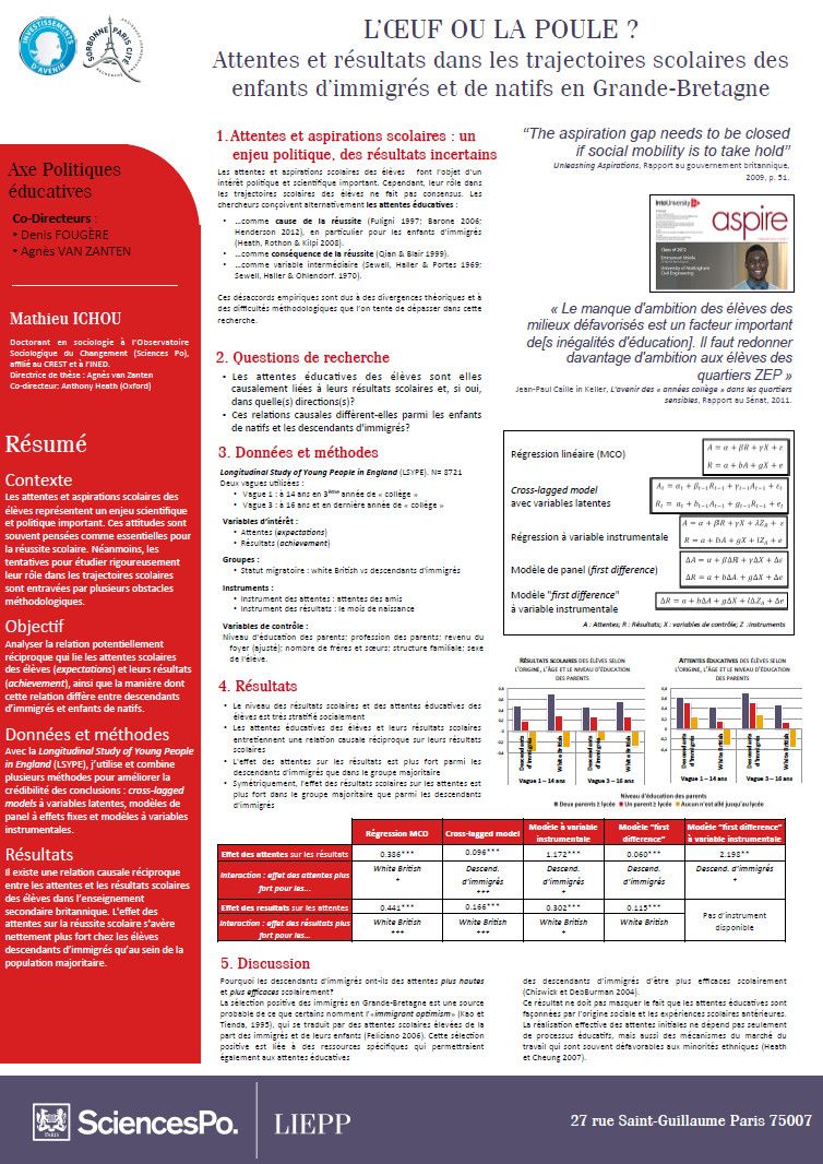 Les aspirations scolaires des élèves sont souvent considérées comme déterminantes dans leur réussite mais elles sont aussi interprétées comme le produit des résultats scolaires. Dans ce projet de recherche, Mathieu Ichou interroge cette relation potentiellement réciproque. Il se demande dans un premier temps si les aspirations scolaires des élèves sont la cause ou la conséquence de leurs résultats scolaires. Dans un deuxième temps, il cherche à savoir si la nature et l’ampleur du lien entre aspirations et résultats varie entre les enfants de natifs et les enfants d'immigrés. Pour ce faire, il mobilise les données de la Longitudinal Study of Young People in England (LSYPE).