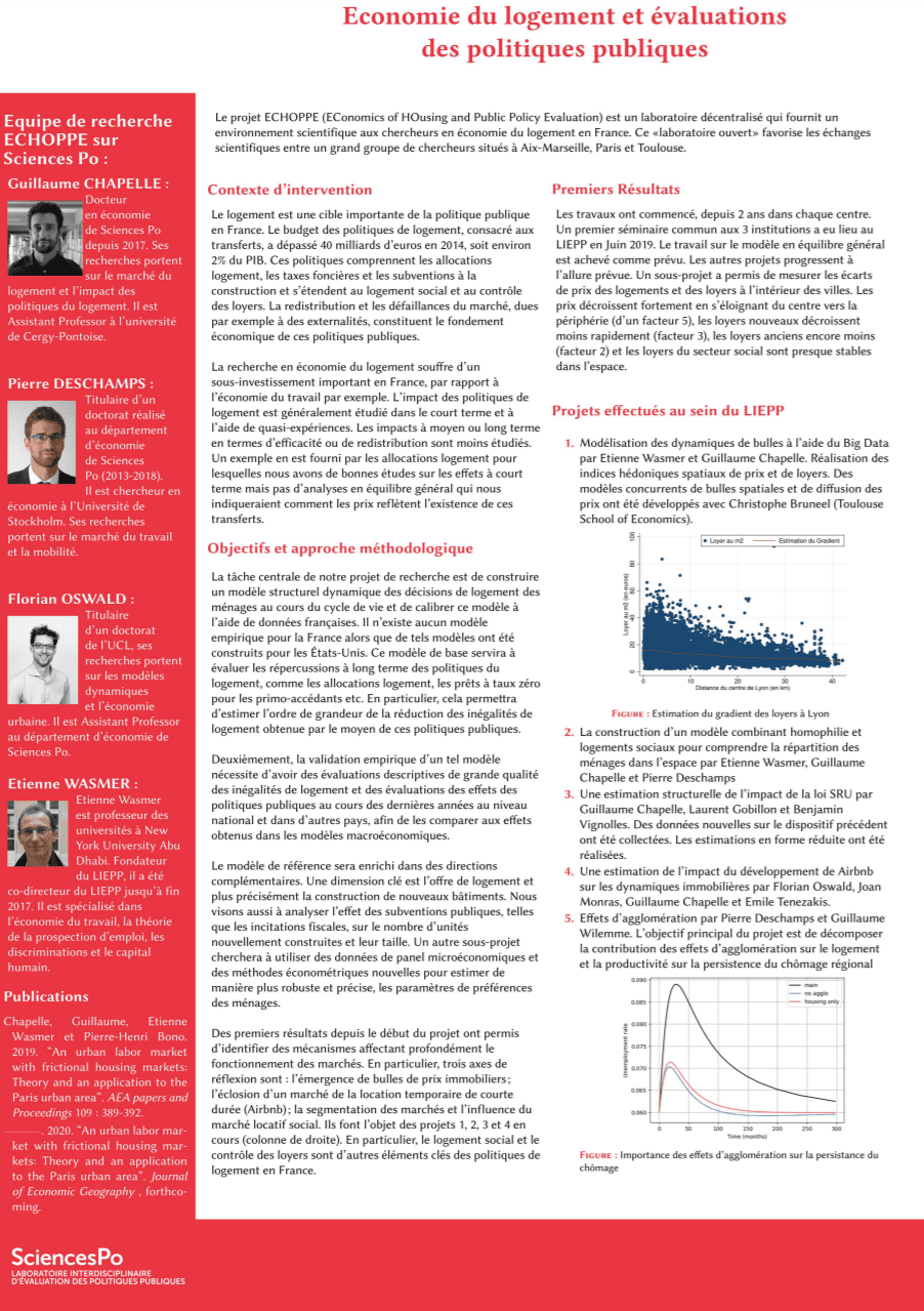 Le logement est une cible essentielle de la politique publique en France. L’effort budgétaire de la Nation a dépassé 40 milliards d'euros en 2014, soit environ 2% du PIB (Comptes du logement, 2014). Les politiques publiques ciblent explicitement la réduction des inégalités en matière de logement. Un large ensemble de politiques (logements sociaux, taxes et subventions à la location ou accès à la propriété, contrôle des loyers, limites des logements sociaux pour les municipalités, etc.) ont été utilisés pour atteindre cet objectif, mais on sait peu quant à leur succès. Même d'un point de vue purement descriptif, il est difficile de dire si l'inégalité du logement en France est plus faible qu'aux États-Unis, au Royaume-Uni ou en Allemagne et de combien. En participant au projet ECHOPPE, l’ambition du LIEPP est d’évaluer ce large spectre de politiques en matière de logement.