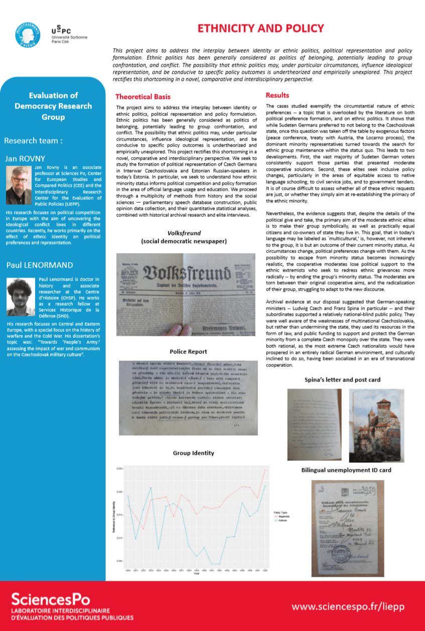 Ce projet vise à interroger les interactions entre politique ethnique/identitaire, représentation politique et formulation de politiques publiques. La politique ethnique/identitaire a été généralement considérée comme relevant de l'appartenance communautaire conduisant à la confrontation, sinon au conflit. La possibilité que la politique ethnique/identitaire puisse, dans certaines circonstances, influencer la représentation idéologique du groupe et conduire à des résultats spécifiques - et constructifs - en termes de politiques publiques, demeure faiblement théorisée et inexplorée sur le plan empirique. Ce projet répond à cette carence dans une perspective innovante, comparative et interdisciplinaire. Nous cherchons à étudier la constitution d'une représentation politique pour les Allemands de Bohême-Moravie dans la Tchécoslovaquie de l'entre-deux- guerres d'une part, pour les Russophones estoniens dans l'Estonie contemporaine, d'autre part. En particulier, nous souhaitons comprendre comment le statut de minorité ethnique influence la compétition politique et la création de politiques publiques concernant l'usage officiel de la langue, notamment dans le domaine de l'éducation. Nous utiliserons une grande diversité de méthodes tirées de l'histoire et des sciences sociales - discours parlementaires au sein d'une base de données en construction, données relatives aux opinions publiques, ainsi que leur analyse quantitative par des outils statistiques, tout cela combiné à une recherche historique en archives et à des entretiens menés avec des membres des élites de la minorité russophone.