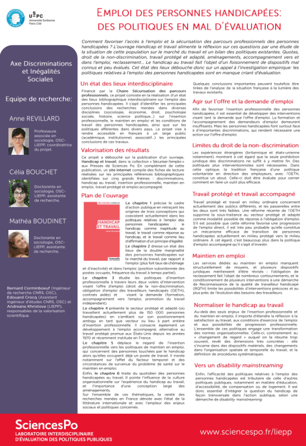 Ce projet a débouché sur la publication d’un ouvrage, Handicap et travail, dans la collection « Sécuriser l’emploi » aux Presses de Sciences Po.