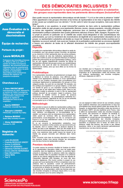 Le projet InclusiveParl étudie les liens entre la représentation politique descriptive (la « présence ») de sept groupes sous-représentés (femmes, jeunes, classes populaires, minorités ethniques issues des migrations, minorités religieuses, personnes avec un handicap, personnes LGBTI+) et leurs représentation politique substantive (c’est-à-dire l’inclusion de leurs intérêts et de leurs demandes dans les activités parlementaires comme sur l’agenda politique) dans les parlements nationaux de quatre pays : la France, l’Italie, l’Espagne et le Royaume-Uni. Ce projet analyse la représentation descriptive à l’aide d’une méthodologie rigoureuse étudiant la visibilité des scripts d’auto-désignation et des caractéristiques ascriptives des parlementaires, qui sont au fondement des revendications de légitimité de la représentation descriptive de tout groupe. La représentation substantive est envisagée au moyen de l’analyse des questions écrites soumises par le législateur au pouvoir exécutif, mais aussi par l’analyse de la participation parlementaire au processus législatif pour quelques textes sélectionnés affectant directement les intérêts des groupes sous-représentés considérés.