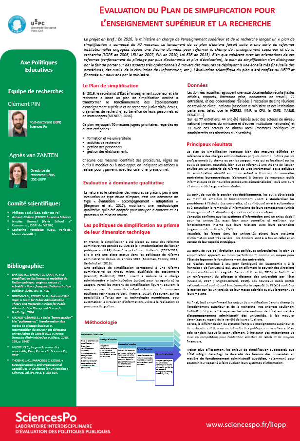 - Clément PIN, Évaluation d'un plan national de simplification adminisitrative. Le cas de l'enseignement supérieur et de la recherche, LIEPP Policy Brief n°50, mars 2020.
