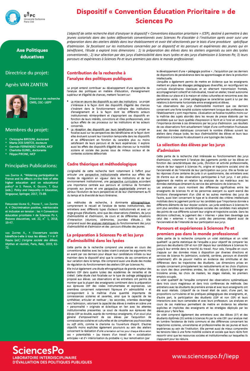 German FERNANDEZ-VAVRIK, Filippo PIRONE, Agnès van ZANTEN, Discrimination positive, méritocratie et inclusion en tension : les "Conventions éducation prioritaire" de Sciences Po, Raisons éducatives, Vol.22, n°1, 2018, p.19-47.