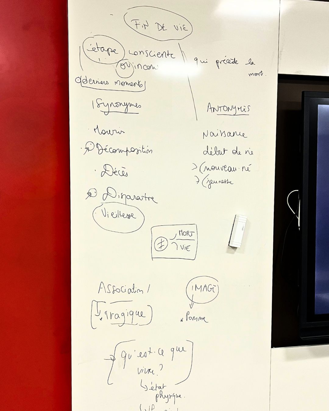 À partir de cette appropriation sensible, les lycéens se sont questionnés sur l’expression elle-même : fait universel, commun à tout vivant et, dans le même temps, éminemment singulier puisque variant objectivement et subjectivement d’un individu à l’autre, comment définir la fin de vie ? De quoi est-elle le synonyme ou l’antonyme ? Ce questionnement nous a permis d’apercevoir que, paradoxalement, la fin de vie était en fait plus proche de la mort que de la vie. Constat qui a suscité notre étonnement : pourquoi la fin de vie serait-elle, en quelque sorte, “moins” que la vie, comme si elle constituait une limitation ou une diminution de la vie même ? Si la mort correspond effectivement à un fait indubitable de nos existences, une telle idée de la “fin de vie”, figée par le langage, ne charrie-t-elle par une évaluation négative quant à cette étape nécessaire ? Comment dès lors bien vivre ce moment, si toute possibilité de bonheur et de joie s’y trouve compromise ? Comment s’y rapporter de manière positive, mais également sereine, confiante, et libre ?