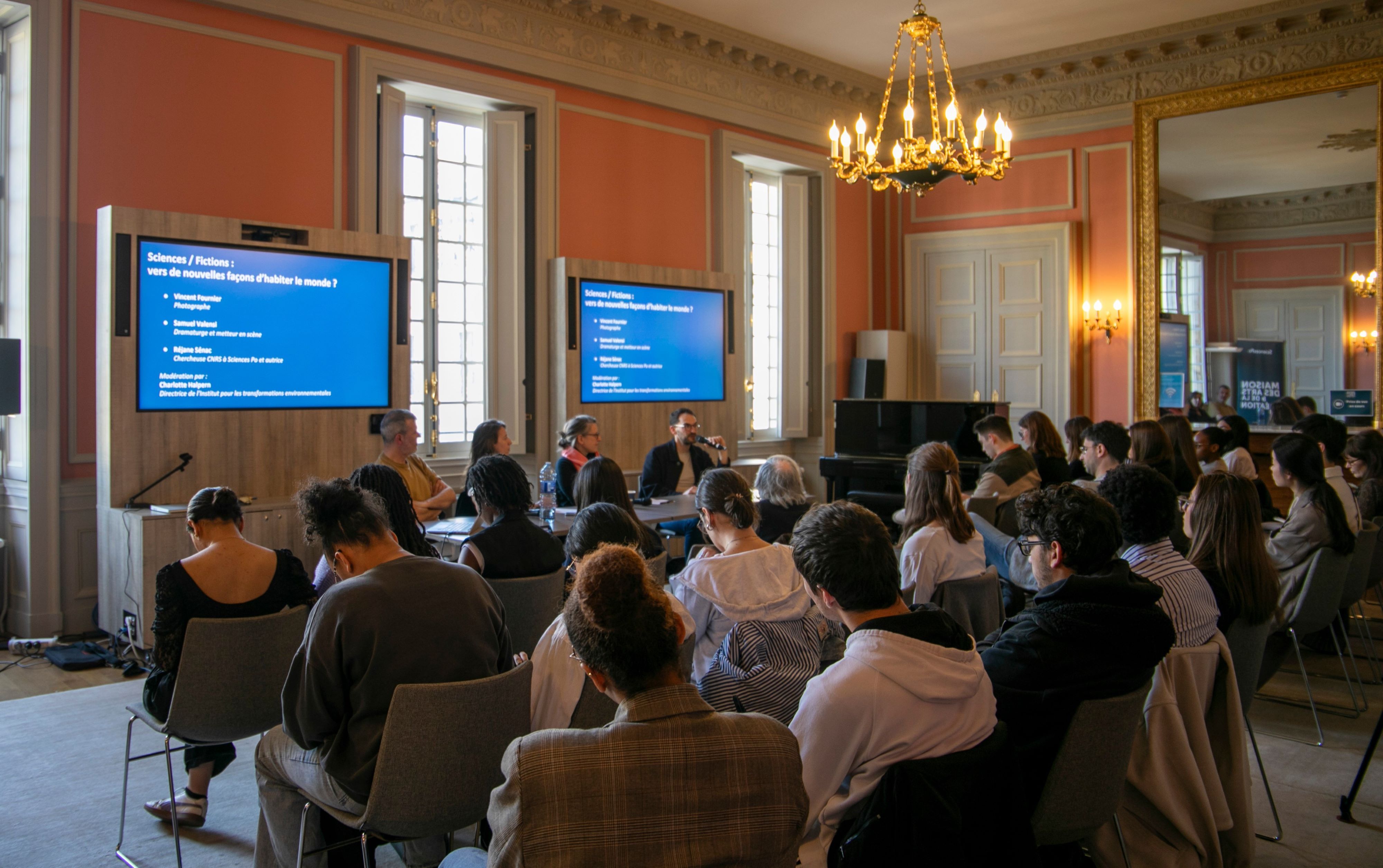 Le 3 avril 2025, à l’occasion de la Journée des Arts et de la Création de Sciences Po, placée sous le thème "Sciences/Fiction", s’est tenue une conférence intitulée "Vers de nouvelles manières d’habiter le monde". Unique conférence de la journée – dominée par des ateliers artistiques, des performances et des retours d’expériences d’enseignement –, elle a permis d’ouvrir un moment de réflexion collective autour de questions comme : comment repenser la place de l’humain dans un monde aux limites de plus en plus tangibles ? En quoi la fiction peut-elle participer de cette réflexion ? Ou encore : quelle place donner aux vivants non humains et, ainsi, penser une société plus égalitaire ?