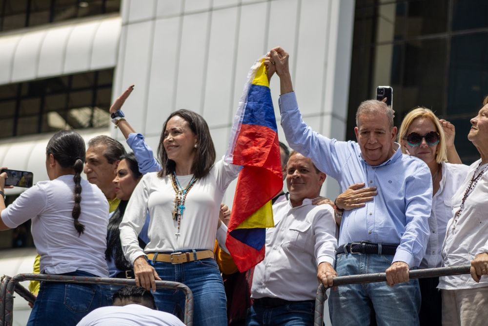 Photo 3 : Caracas, Venezuela (30 juillet 2024) : Les dirigeants de l'opposition Maria Corina Machado et Edmundo Gonzales Urrutia saluent des milliers de Vénézuéliens dans les rues. Crédit Jonathan Mishkin pour Shutterstock.